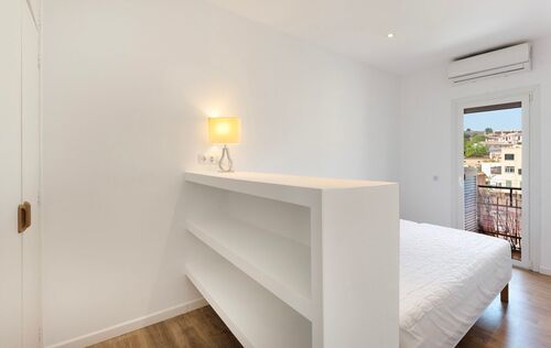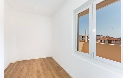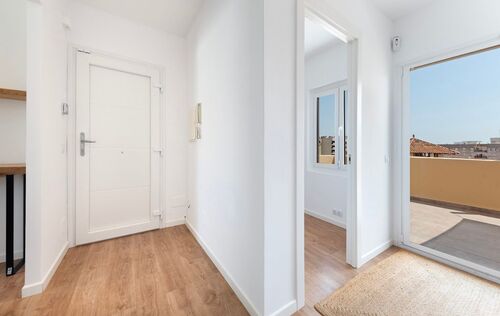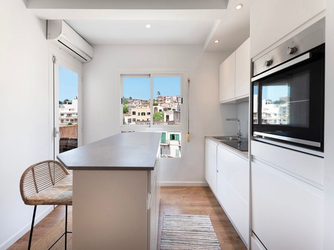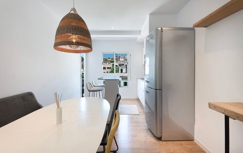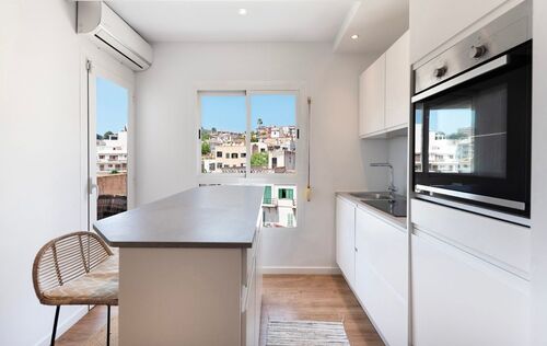 In the heart of the emblematic El Terreno neighborhood, in Palma de Mallorca, is this bright renovated penthouse, a modern refuge with a Mediterranean soul. Located on the fifth floor, the property has been carefully renovated and offers a functional layout with two bedrooms, a full bathroom, an open kitchen with a dining area, a spacious terrace, and a balcony. From the terrace, there are clear views of the sea and the port; from the balcony, views of the park's greenery and the majestic Bellver Castle. Thanks to its orientation, the sun accompanies it throughout the day, creating a warm and welcoming atmosphere in every corner.