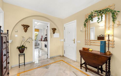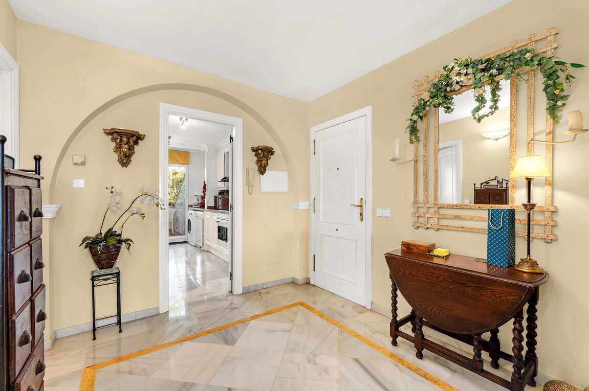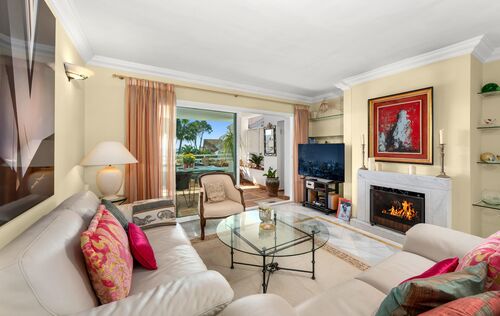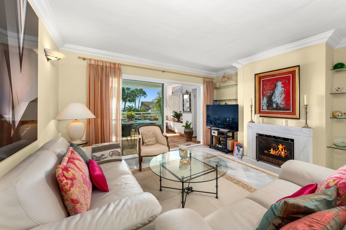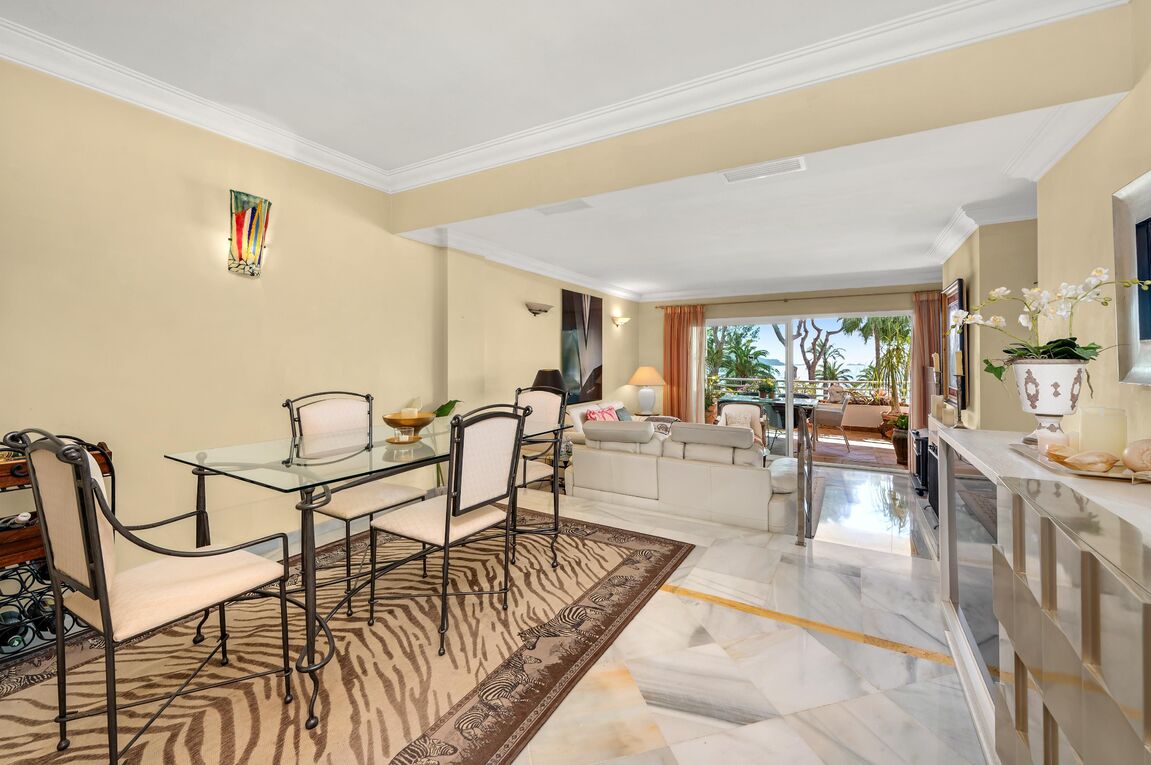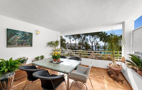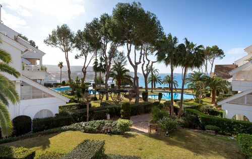 Located in the most sought-after area of Nova Santa Ponsa, this exceptional apartment enjoys a beautiful position within a prestigious and impeccably maintained gated frontline community. Surrounded by lush Mediterranean landscaping and overlooking the sparkling blue waters of the southwest coast of Mallorca, the property offers a rare combination of privacy, tranquility, and breathtaking sea views. With approximately 114 m² of living space, the apartment impresses with a spacious living and dining area that opens directly onto a private terrace with views to the sparking pool area and to the sea - an ideal setting for relaxing, entertaining, or enjoying unforgettable evenings. The fully equipped kitchen is designed for both functionality and comfort. The residence features two generous bedrooms, both with ensuite bathrooms, and ample storage space. Mediterranean architectural elements, elegant marble floors and double-glazed windows create a warm and timeless atmosphere. Modern comforts include radiator heating and a pre-installation for air conditioning, which ensure year-round living at the highest level. Residents benefit from access to beautiful communal pools set within palm-lined gardens, offering a true resort-style ambiance directly by the sea. One of the standout features is the exceptionally rare sea-front community, making this property a true jewel in Nova Santa Ponsa. The parking space in community garage provides ample space for vehicles, storage, or recreational equipment. Just minutes away, the renowned Port Adriano marina offers an exclusive lifestyle with fine dining restaurants, stylish bars, boutiques, and a wide range of water sports including sailing, diving, and paddle surfing. The nearby sandy beach further enhances the appeal of this outstanding location. This property represents a unique opportunity to acquire a Mediterranean home in one of Mallorca’s finest coastal settings.