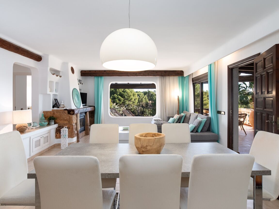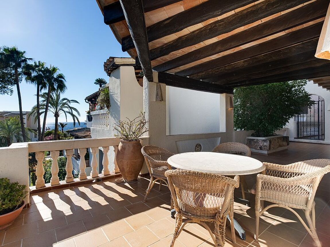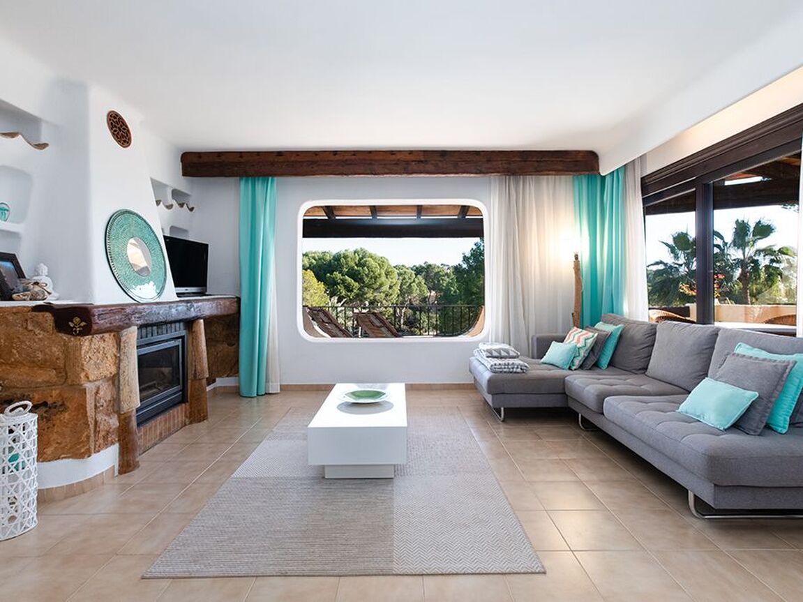 This lovely apartment is located in one of the most sought-after communities in Costa de la Calma. Surrounded by nature, accented with bougainvillea and colorful Mediterranean gardens and tilework, this complex has a unique water landscape with four pools, one jacuzzi and a restaurant nestled in the large terraces and lush gardens. The complex enjoys direct sea access from where you can begin your morning with a dip in the sea. The apartment has 2 bedrooms and 2 full bathrooms, a partially open modern kitchen, and a bright living and dining area with a beautiful Ibiza style fireplace, opening to the lovely terrace with sea views. The terrace is partly covered and offers nice privacy. This property will shine with a little renovation! The special Mallorquin styling of this beloved community and the many advantages of this peaceful home makes for an excellent opportunity to own in a community which rarely has homes available for sale. The next beach bar is reached within a 5 minute walk and by car you can easily reach the shops and restaurants of Santa Ponsa, several popular golf courses, and the harbour of Port Adriano. Extra amenities include air conditioning h/c.