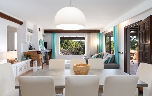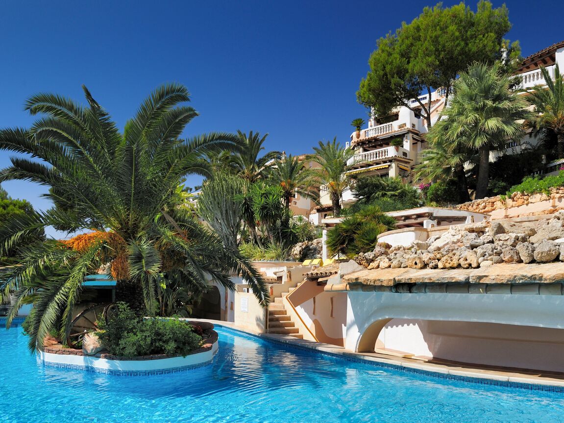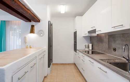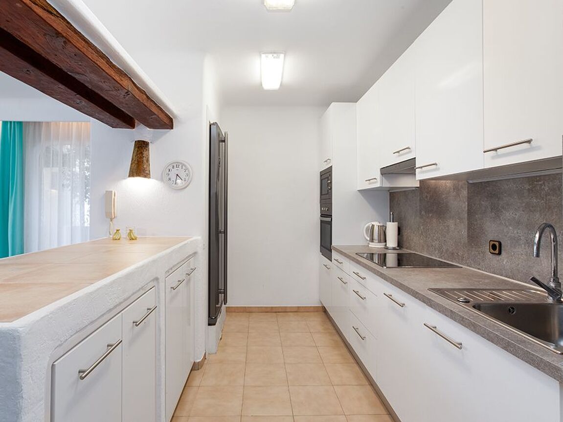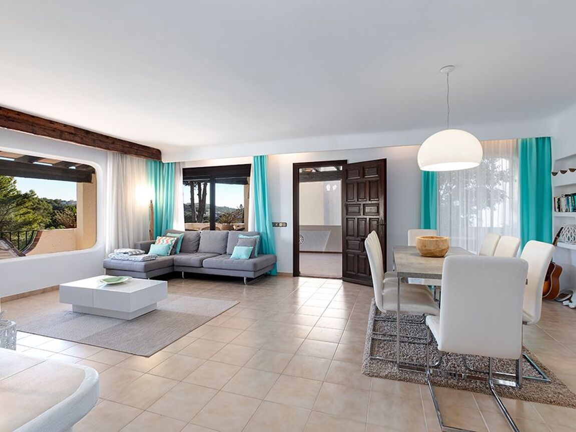 This lovely apartment is located in one of the most sought-after communities in Costa de la Calma. Surrounded by nature, accented with bougainvillea and colorful Mediterranean gardens and tilework, this complex has a unique water landscape with four pools, one jacuzzi and a restaurant nestled in the large terraces and lush gardens. The complex enjoys direct sea access from where you can begin your morning with a dip in the sea. The apartment has 2 bedrooms and 2 full bathrooms, a partially open modern kitchen, and a bright living and dining area with a beautiful Ibiza style fireplace, opening to the lovely terrace with sea views. The terrace is partly covered and offers nice privacy. This property will shine with a little renovation! The special Mallorquin styling of this beloved community and the many advantages of this peaceful home makes for an excellent opportunity to own in a community which rarely has homes available for sale. The next beach bar is reached within a 5 minute walk and by car you can easily reach the shops and restaurants of Santa Ponsa, several popular golf courses, and the harbour of Port Adriano. Extra amenities include air conditioning h/c.
