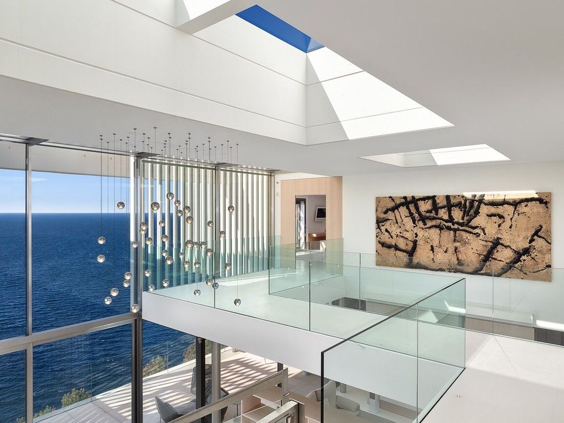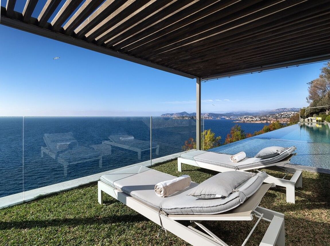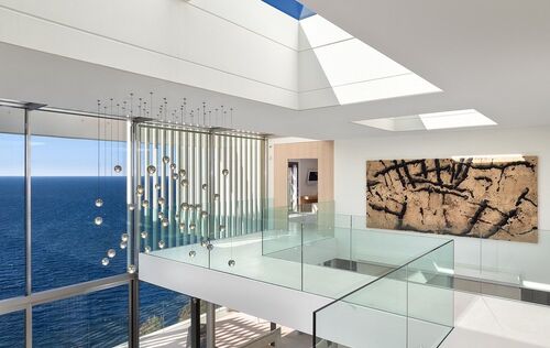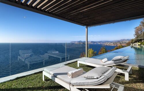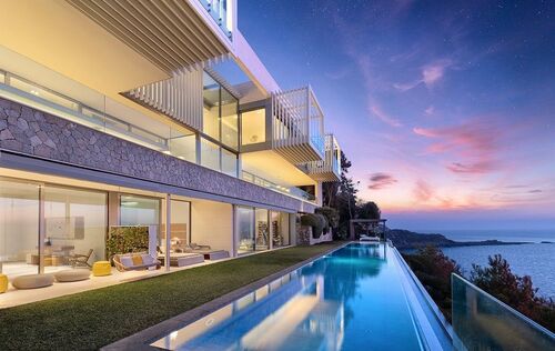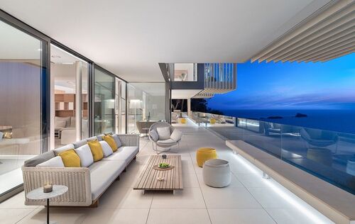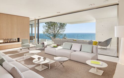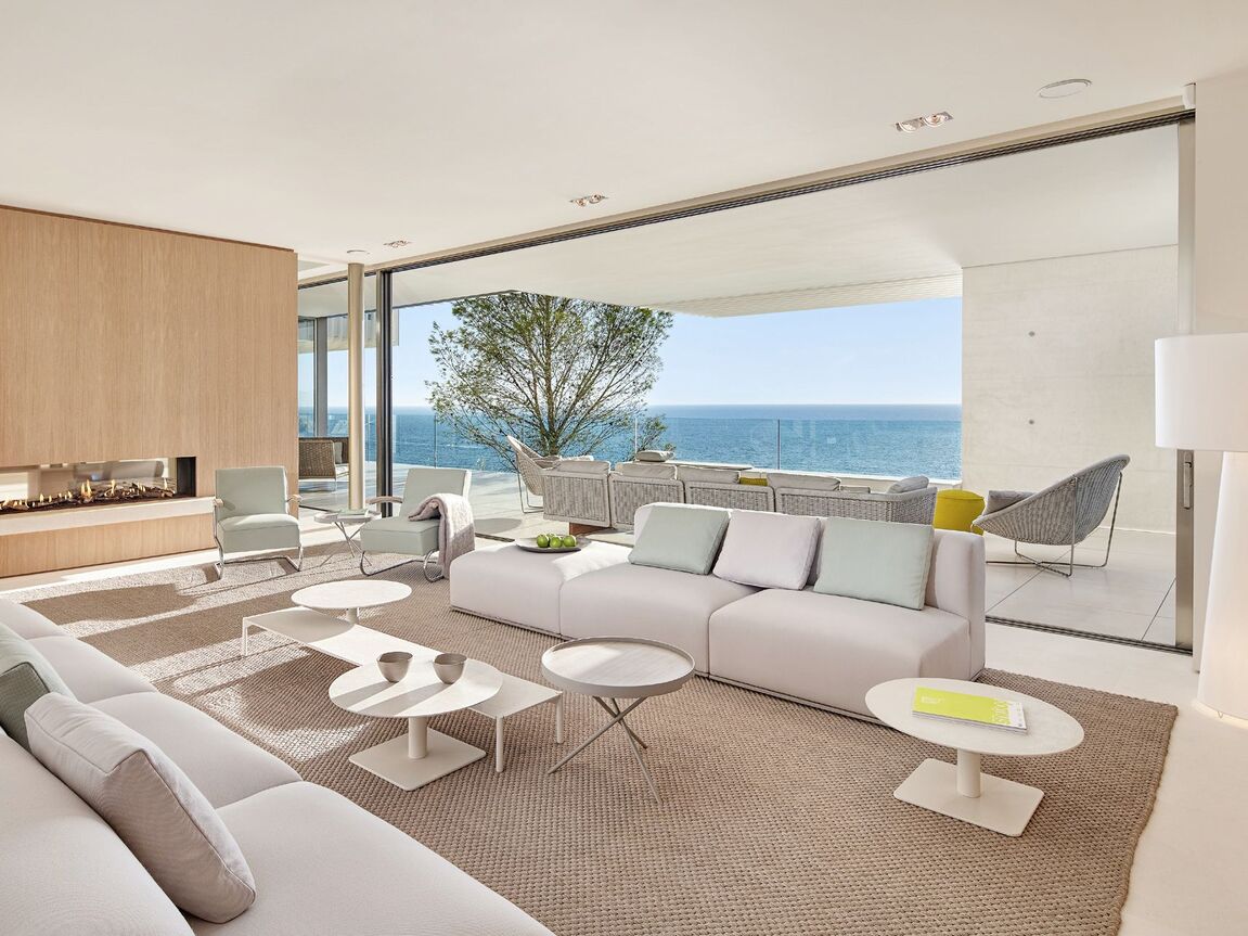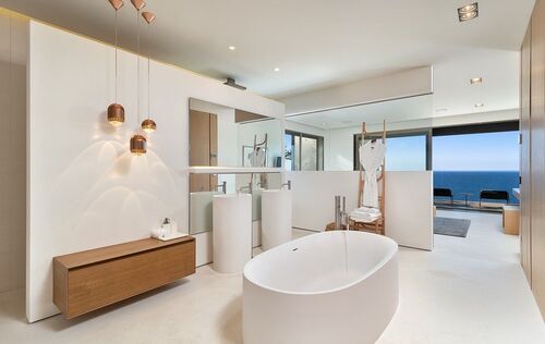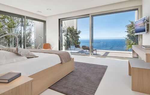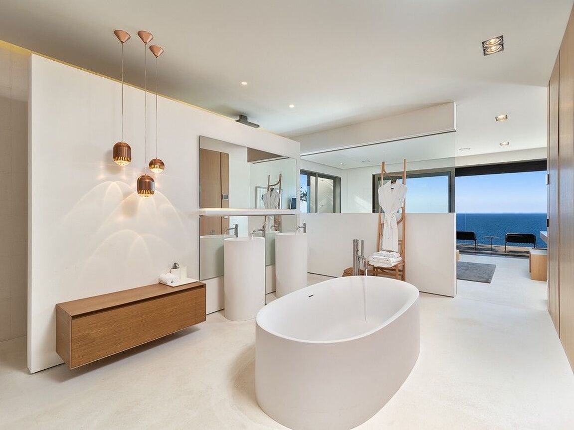 Enjoy the ultimate seafront experience with our exclusive property close to the prestigious superyacht harbour Port Adriano. This premium double plot offers breathtaking southwest views, stretching from the Mallorcan coastline to Ibiza. Rarely does a property have the privilege of owning private access to the sea, so this is a unique opportunity. The elegant and contemporary design, with white concrete and large windows to the ceiling, provides light and harmoniously blends indoor and outdoor spaces. The timeless and elegant architecture combines limestone and oak wood with modern materials. The luxurious amenities and delicate design create an exceptional experience. The property has six bedrooms, each with en-suite bathroom, and fascinating sea views. There is also a staff accommodation, providing further comfort and practicality. The interior is spacious and elegant, with two living rooms, a dining room and two kitchens designed by Boffi and Gaggenau. The spa offers the ultimate in relaxation and wellness with steam bath, Effegibi sauna, relaxation room, indoor pool/jacuzzi and gym (Technogym) overlooking the sea. The covered terraces and chill-out area offer an ideal setting to enjoy the magnificent views. The outdoor area is equally impressive, with a 30m self-cleaning swimming pool, grass lawn and garden with irrigation system. The wine cellar and storeroom with independent cooling devices are ideal for valuables storage. The property is secure, with Schüco glazing, mosquito nets and automatic blinds, and a security system with cameras and sensors for doors and windows. The interior design is cosy and attractive, with LED lighting from Flos, Delta Light, Bega, etc. The Busch-Jaeger and Siedle home automation system offers innovation and convenience, while the Bang & Olufsen sound system and TV in every room ensure entertainment. The property features underfloor heating, hot/cold air conditioning in all rooms, solar panels and a heat pump for energy efficiency. In conclusion, this property offers an unrivalled opportunity to experience luxury, modern design and breathtaking views. The combination of warm, modern materials, contemporary architecture, and meticulous design allows for a perfect balance between luxury and Mediterranean living, making this property a true masterpiece.