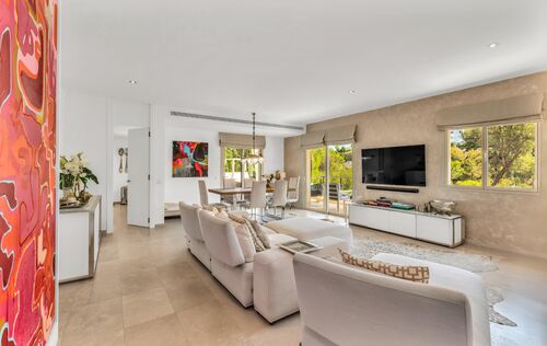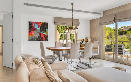 This high-quality apartement combines modern design, first-class furnishings and an exceptionally spacious room concept. Four bright bedrooms and four elegant bathrooms offer plenty of space for family and guests. The spacious living and dining area boasts large windows that flood the room with natural light and opens out onto a wonderful terrace and a cosy balcony - ideal for relaxing and enjoying the view of the greenery. The many highlights include two modern communal pools for refreshing hours outdoors, numerous storage rooms within the flat for additional storage space as well as a practical storeroom and a garage parking space. If necessary, an additional garage space can be rented. The modern gas underfloor heating (town gas), air conditioning and a fine stone floor that radiates timeless elegance offer the highest level of comfort. An integrated Sonos sound system and a water filter round off the exclusive features. The flat has been partially renovated and is in mint condition. In a quiet location yet with excellent connections, this apartement is an ideal home for anyone who appreciates spacious living, high-quality furnishings and a stylish ambience.