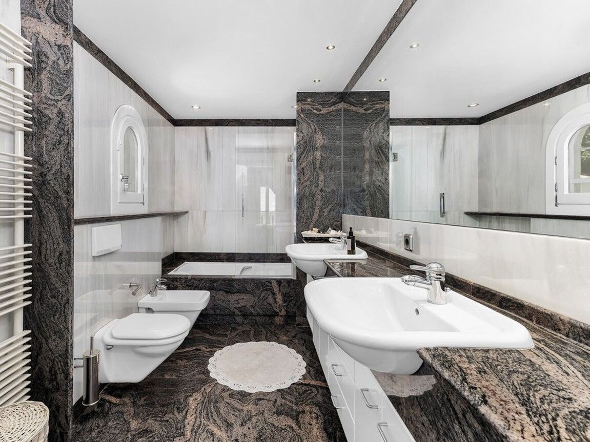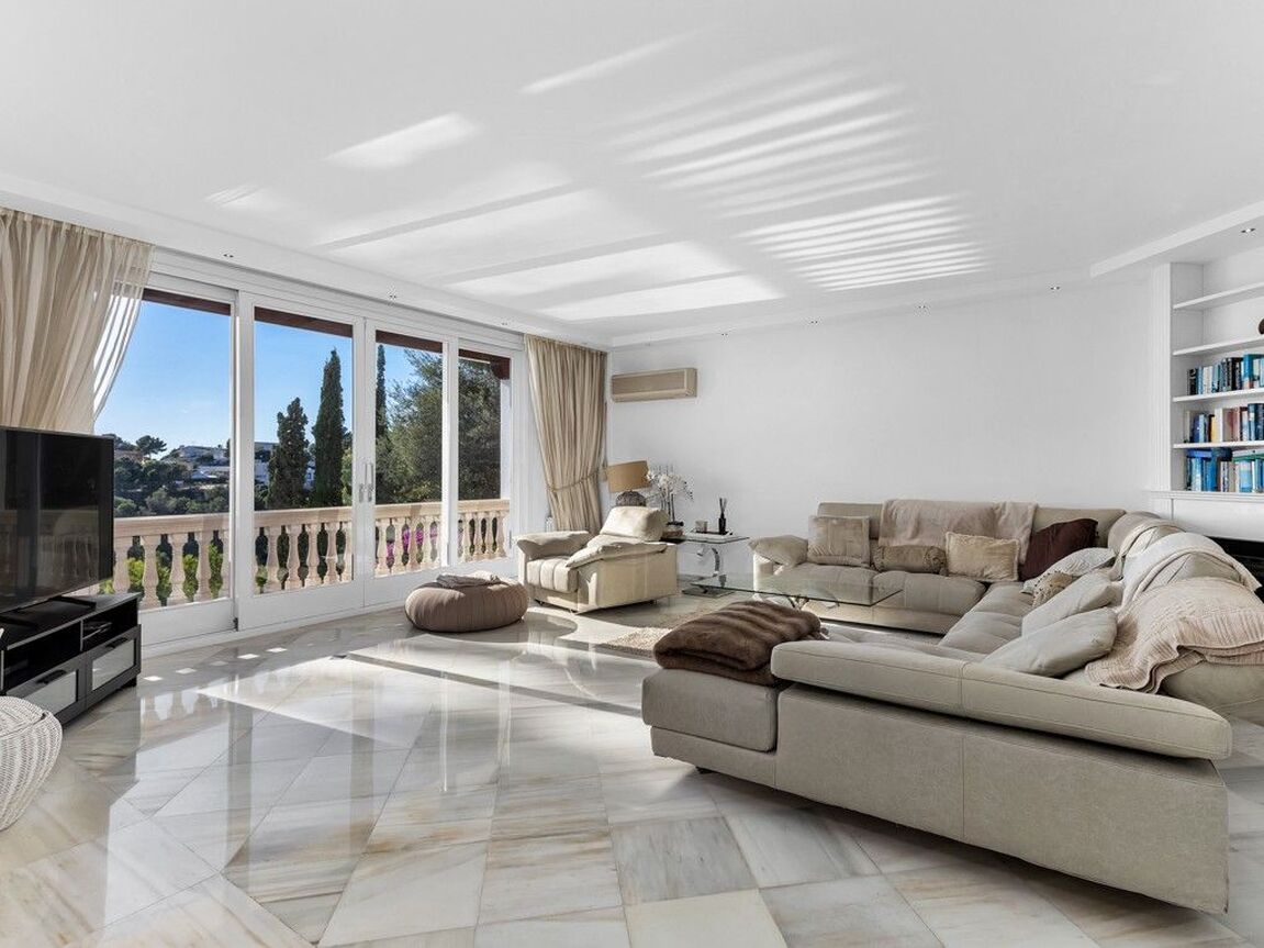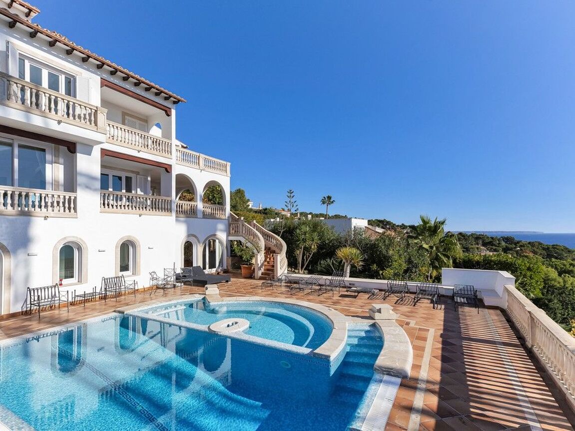 This beautiful villa overlooking the yachting harbour of Puerto Portals is located on the hills of Costa d’en Blanes. The property layout covers 4 floors with a lift installed for easy access and consists of the following: Entrance, large living/dining area with fireplace and direct access to the terrace, spacious kitchen with breakfast area, 5 bedrooms, 6 bathrooms (2 of them en suite), additional kitchen in guest apartment and separate office. Several open and covered terraces with gorgeous sea views and the spectacular swimming pool which includes Jacuzzi, water fountain and counter-currant swimming machine are the perfect places to relax. Extras such as double glazing, marble flooring throughout and two parking spaces. The location is ideal for someone wishing to acquire a property within minutes to the harbour, beaches, the golf course of Bendinat, Palma city and also within just 20 minutes by car from the International airport.