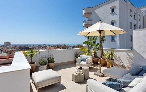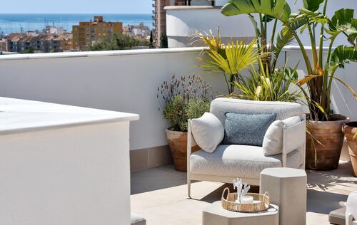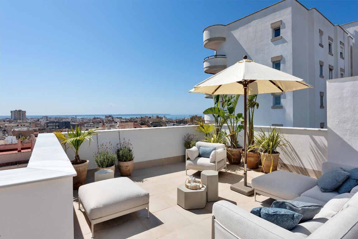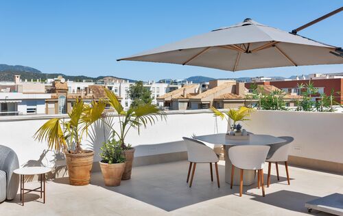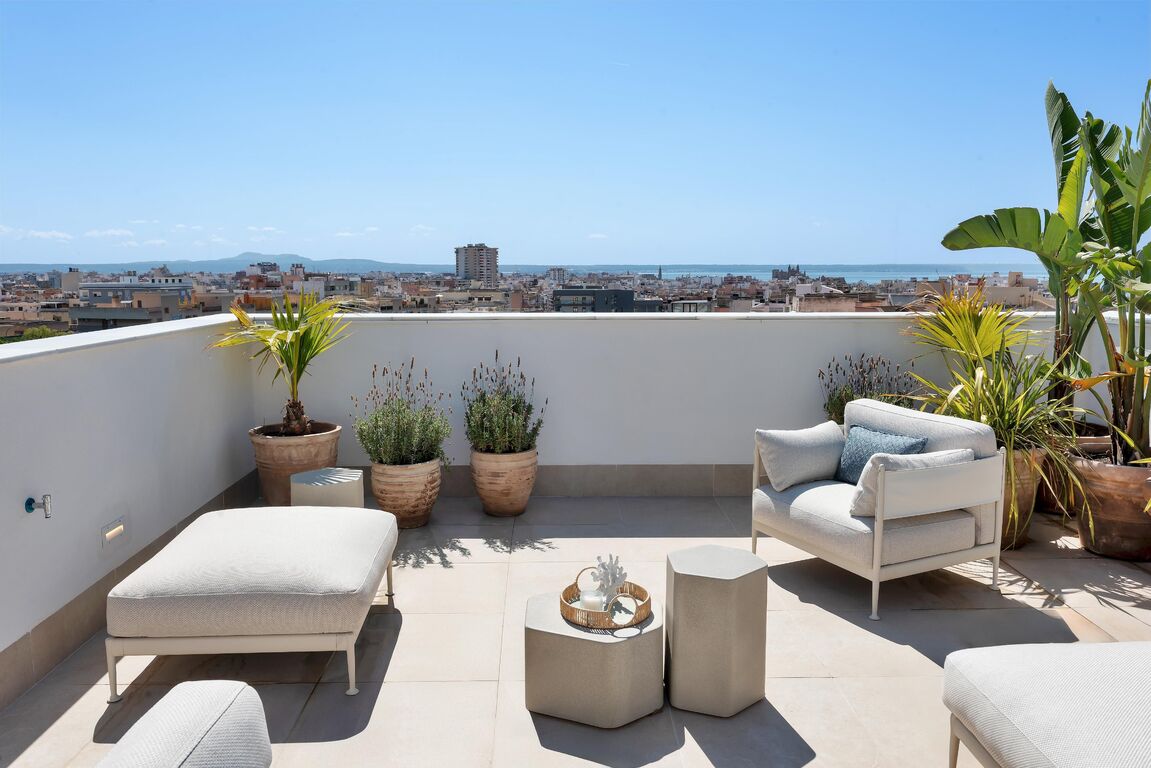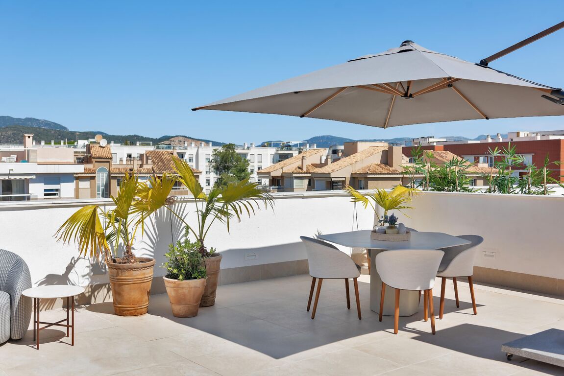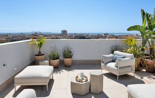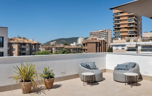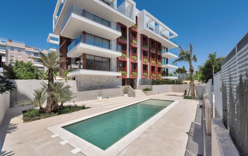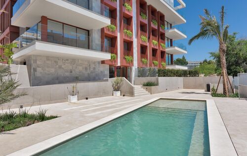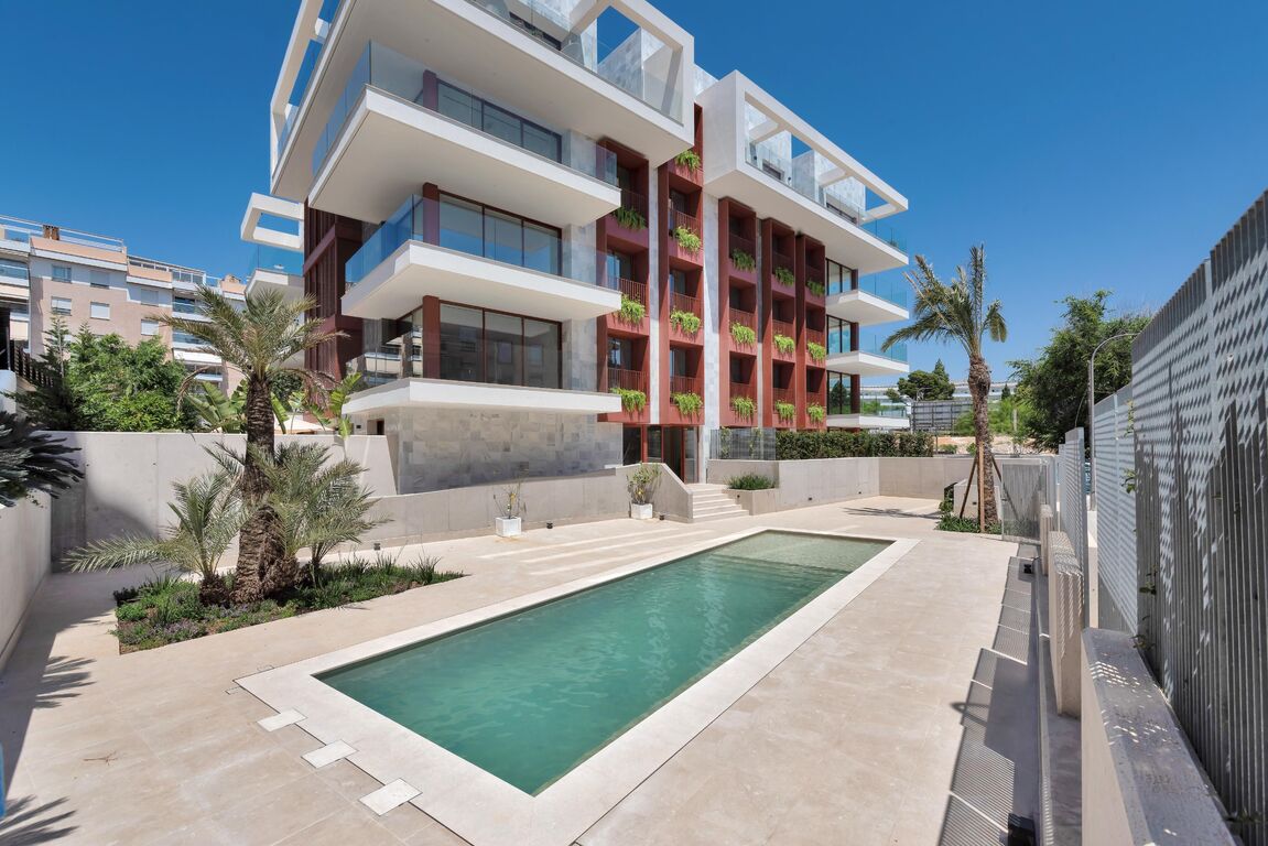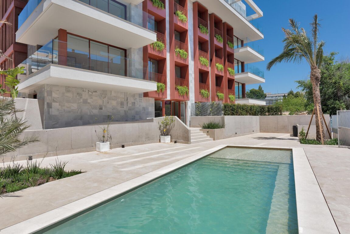 This modern residential complex has been built in Palma's Son Dameto district, within walking distance of the centre of the island metropolis. In addition to numerous sports and leisure facilities and shops for daily needs, there are also several schools in the immediate vicinity. The architecturally appealing project with an avant-garde partly green facade consists of 18 apartments with 2 to 4 bedrooms and an inviting community pool with sun terrace and outdoor fitness area. The spacious garden apartments with 3-4 bedrooms and 2 bathrooms (one of which is en suite) include extensive private gardens with their own pool and the penthouses, all with 3 bedrooms and 2 bathrooms (one of which is en suite), offer the luxury of a spacious roof terrace with views of the city and the sea, in addition to a generous terrace on the living level. A successful combination of various natural materials was chosen for the design of the apartments, which are fitted to a high standard: Stone and concrete give the interiors a noble character, while glass gives it modernity. Large floor-to-ceiling windows ensure that plenty of natural light enters the open-plan living and dining areas, creating a smooth transition between the large terraces and the spacious living areas with integrated kitchens (equipped with built-in Bosch appliances or similar; penthouses Miele or similar). Air conditioning and underfloor heating (operated by a heat pump) ensure a pleasant living climate all year round. In addition, a parking space and a storage room in the underground garage are included in the price (garden apartments and penthouses 2 parking spaces). Elevators are also available. In this high-quality new built development, you live comfortably all year round in a good and central location.
