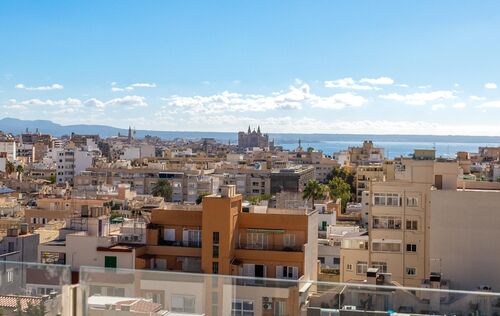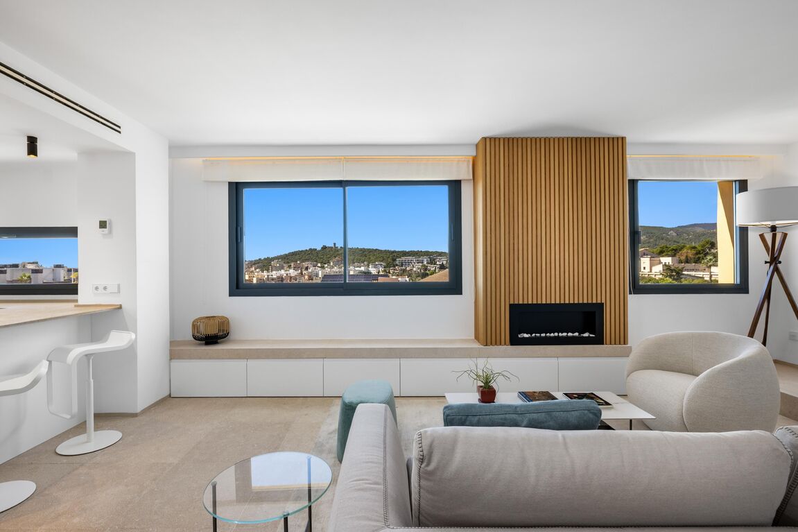 The main floor features a spacious open area that integrates living room, dining room, and kitchen. The bioethanol fireplace adds a touch of warmth and elegance, while the natural stone floors enhance the sense of exclusivity and harmony. On this floor, there is also a guest toilet. The upper floor houses three bedrooms and two designer bathrooms, including a master suite with a private bathroom. The entire home is equipped with gas underfloor heating, air conditioning (A/C), and an alarm system, ensuring maximum comfort and security throughout the year. A few steps higher leads to the true protagonist of the home: a private rooftop terrace with 360° panoramic views encompassing the Cathedral of Palma, the sea, the mountains, and Bellver Castle. An unparalleled place to enjoy the sun, relax, or celebrate special moments outdoors. Just a few minutes from the lively Santa Catalina neighborhood, you can enjoy its traditional market, signature restaurants, charming cafes, schools, medical centers, and green areas. This penthouse represents an exceptional opportunity for those seeking to combine urban living in Palma with tranquility, style, and the most privileged views of the city.