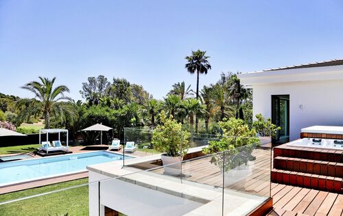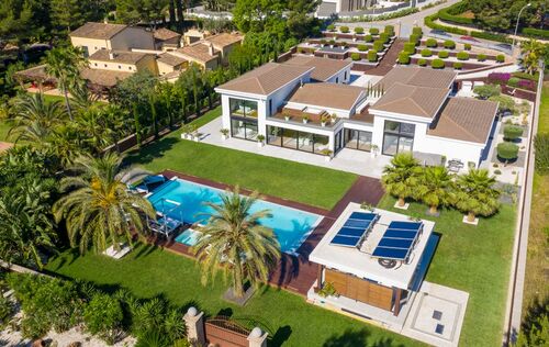 This luxurious golf villa has been lovingly refurbished, only using the highest quality materials and will also meet the highest standards in terms of quality, home technology and design! The property is located primarily to Santa Ponsa Golf court, in a quiet street with no through traffic. The very flat plot measuring 3,283 square meters underlines the generosity of the property, a 16-meter swimming pool (pre-installation for heating exists), Jacuzzi and a perfectly equipped, covered barbecue area make the outdoor area the summer living room of the property. The villa was built with attention to a bright and open space concept, which is underlined by the home technology (controlled by a user-friendly domotic system). No time or money has been spared in terms of equipment and design - many details such as the isolation of the property or even a special breathable interior plaster may not be immediately visible, but mean a special living comfort when living in the property. Six suites, an office and 2 guest apartments are available - except of two rooms, the bedrooms are on one level, so that this exceptional property is ideal for families with children and people with reduced mobility. Security-minded people will be interested in the fact that both windows and doors belong to a higher security level and it is possible to create a panic room (pre-installations exist). Further features of this villa are: home theater, wine cellar, gym, underfloor heating (with two heat pumps), reversible air condition, garage for several vehicles.