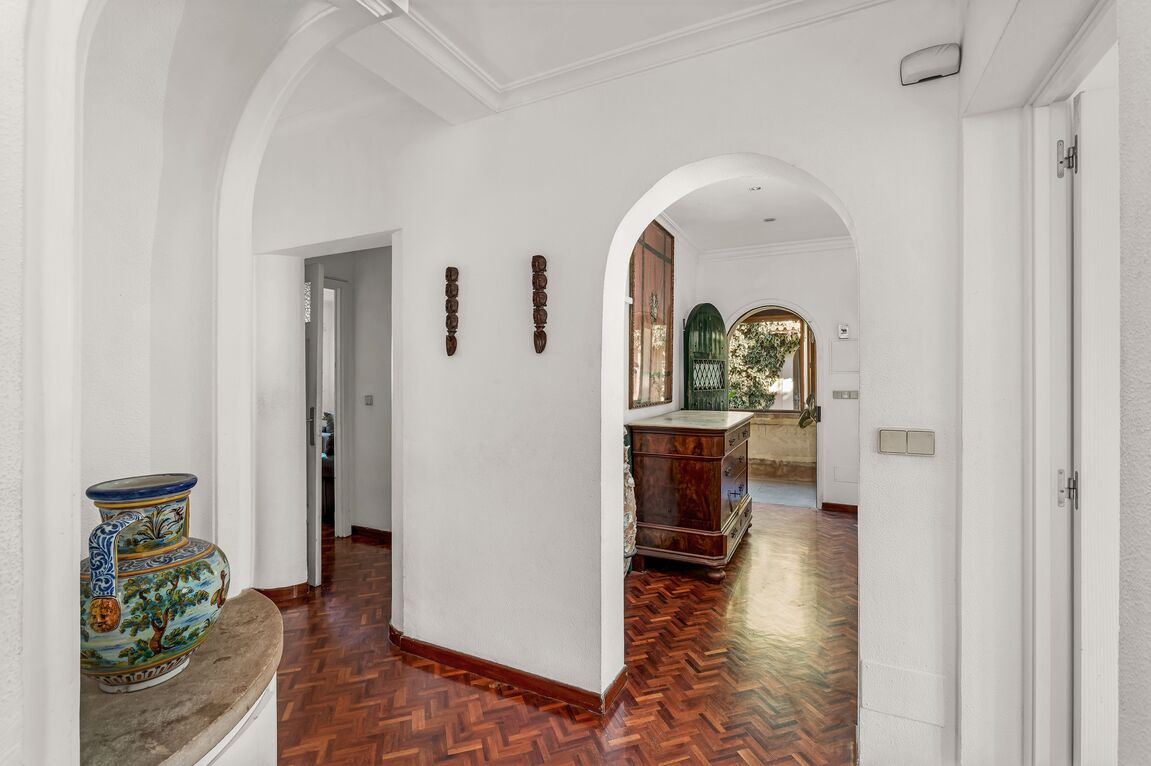 One of the few properties in Son Armadams that combines a spacious private garden with a swimming pool and a home full of historical character, this stately villa from 1940 represents a truly exceptional opportunity in Palma. With approximately 311 m² built, the house features horizontal division, creating a separate apartment on the upper floor. It offers 4 bedrooms, 4 bathrooms, two elegant living rooms, and an independent kitchen, as well as a distinctive panoramic tower that adds architectural personality and open views. High ceilings, generous proportions, and preserved original elements maintain the essence of traditional mid-20th-century Mallorcan architecture. The exterior is undoubtedly its greatest privilege: a true urban oasis with a large established garden and a private swimming pool, something extraordinarily rare in this area. Particularly noteworthy is the charming independent outbuilding currently used as a barbecue area, equipped with an old wood-fired oven and a full kitchen, full of Mediterranean character. This space could easily be transformed into an elegant guest suite or independent studio, adding exceptional value. The property requires full renovation, offering the opportunity to design a high-end contemporary residence while preserving its historic essence. A unique piece for those looking to create an exclusive and fully personalized villa in one of Palma’s most sought-after locations, with strong potential for appreciation.