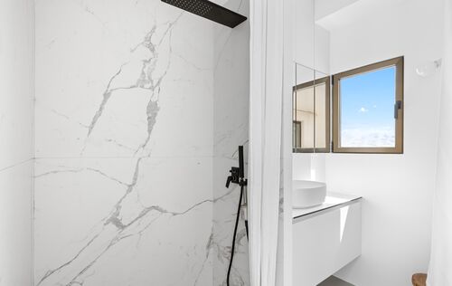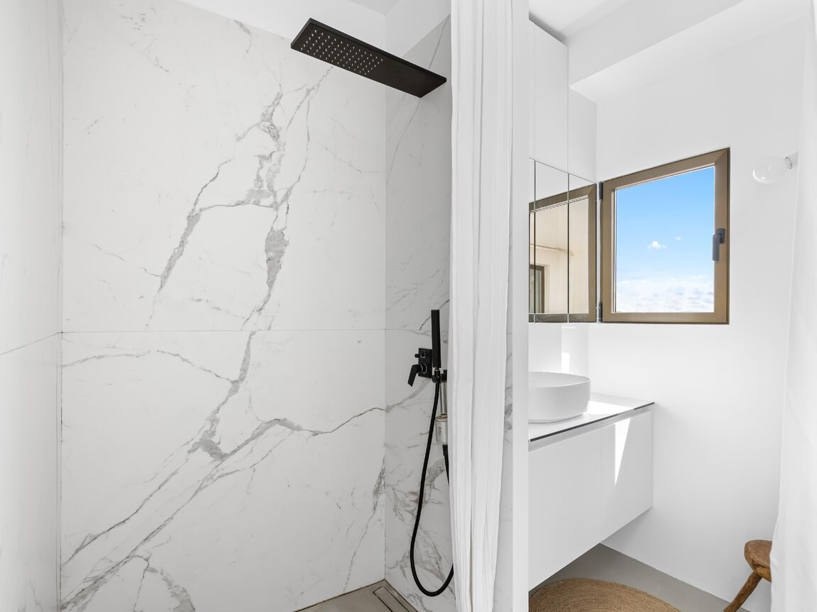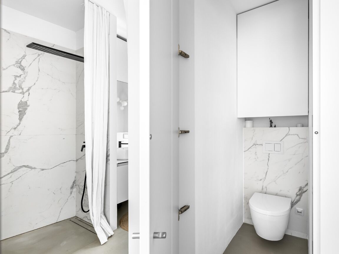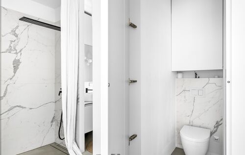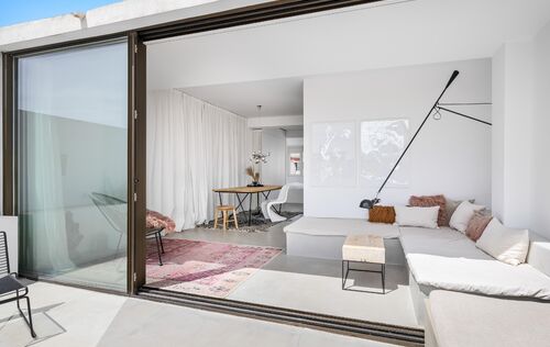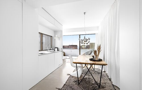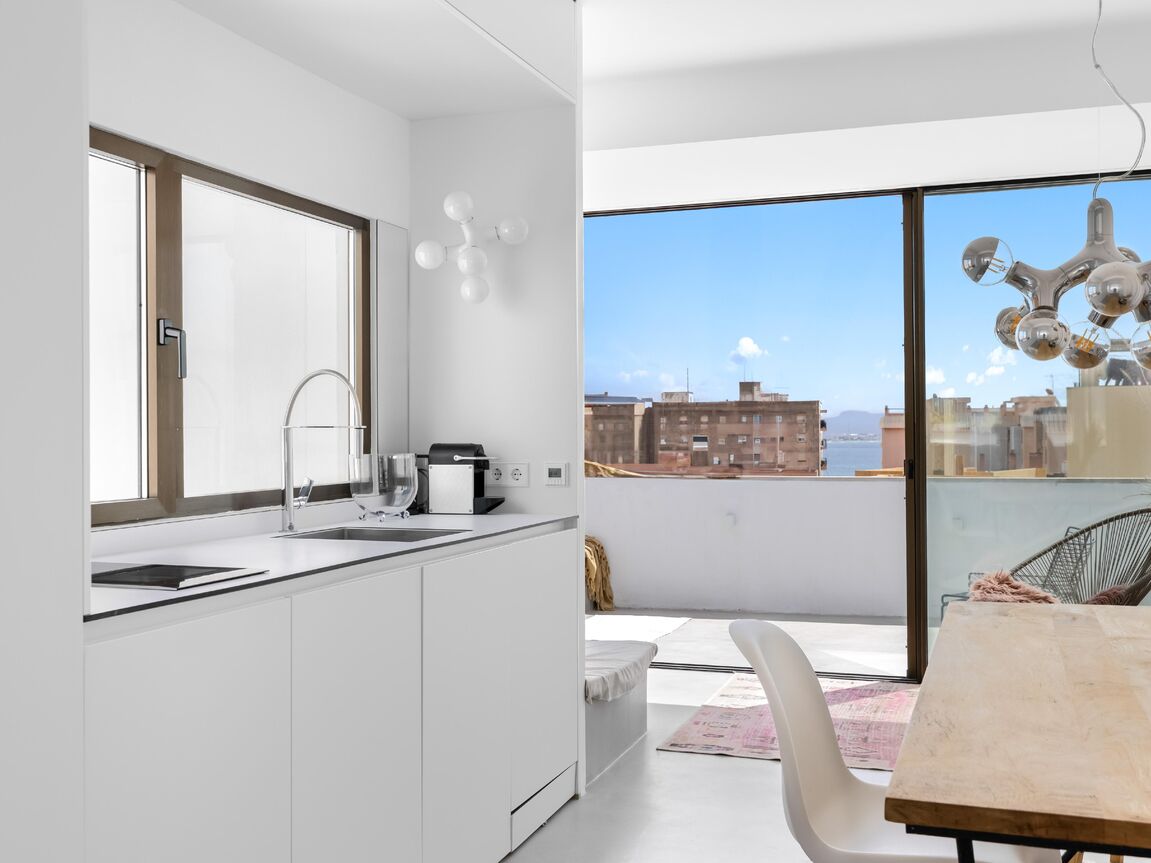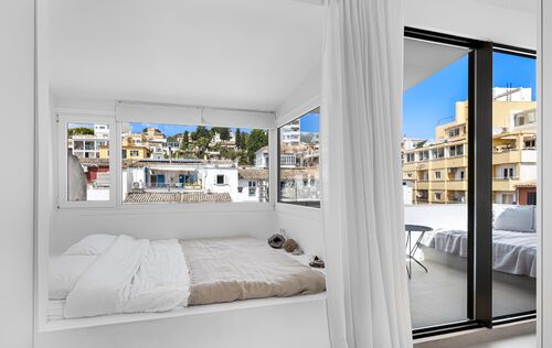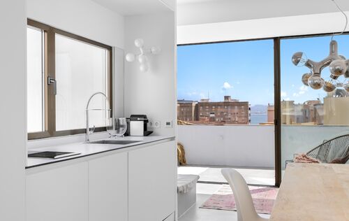 In the midst of the trendy El Terreno district, one of Palma's most sought-after locations, this completely renovated studio is a stylish retreat with urban flair. With a living space of 38 m², the property combines modern design, high-quality materials and well thought-out interior design to create an exclusive living experience. Particularly noteworthy is the high-quality fitted kitchen from the renowned Leicht brand, which impresses with its clean lines and state-of-the-art technology - ideal for anyone who appreciates aesthetics and functionality. Elegant surfaces, selected materials and electric underfloor heating ensure maximum living comfort all year round. A real highlight is the spacious 17.65 m² terrace, which not only offers a marvellous view over the rooftops of the city, but also lets you feel the proximity to the sea. Whether it's breakfast in the morning sun on the front terrace or a glass of wine in the evening on the rear terrace - these outdoor areas are the ideal places to linger and enjoy. Despite its central location in the centre of the vibrant city life, the studio remains a place of tranquillity - a small refuge above the rooftops of Palma that combines stylish living with a Mediterranean lifestyle.