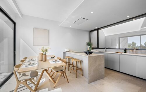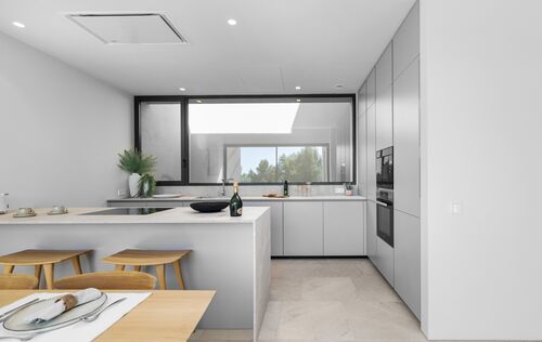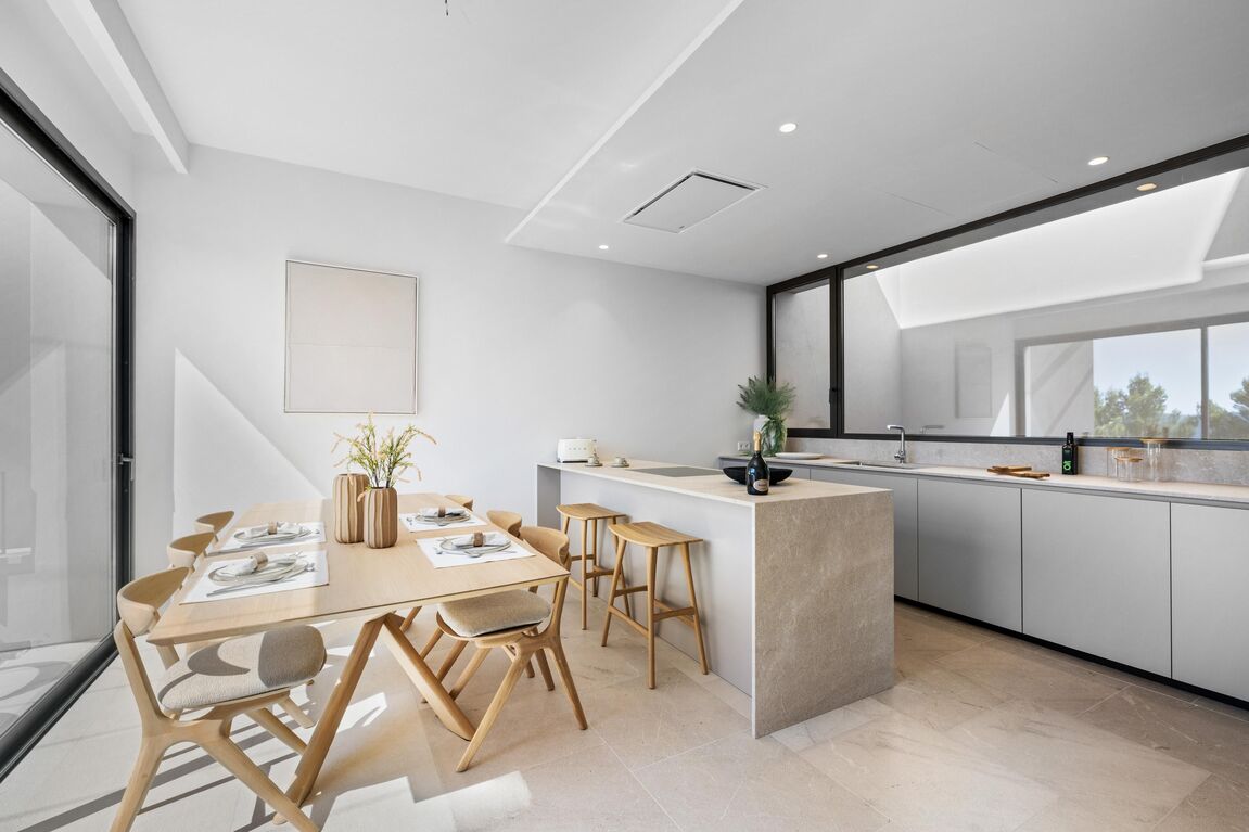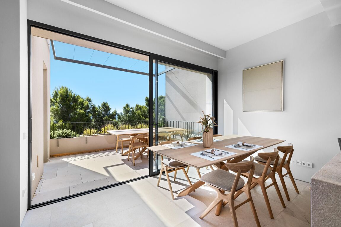 This exclusive designer residence combines Mediterranean luxury with state-of-the-art amenities and offers the highest level of comfort on several floors. On the upper floor, a spacious living and dining area with an open Poliform kitchen, stylish fireplace and panoramic views of the Tramuntana mountains invites you to linger. High-quality designer furniture, selected works of art and thoughtful details create a refined ambience. A guest WC completes the living area. On the ground floor there is a luxurious master bedroom with en-suite bathroom and dressing room, as well as two further spacious double bedrooms and an additional bathroom. Custom-made fitted wardrobes and stylish furnishings ensure comfort and elegance in all rooms. The roof terrace with private pool, high-quality outdoor kitchen and views over the harbour of Port Andratx is the perfect place to relax. In the basement, two utility rooms, a technical room and a large garage with direct access to the street offer practical functionality. The property is rounded off by Mediterranean gardens and a communal infinity pool.
