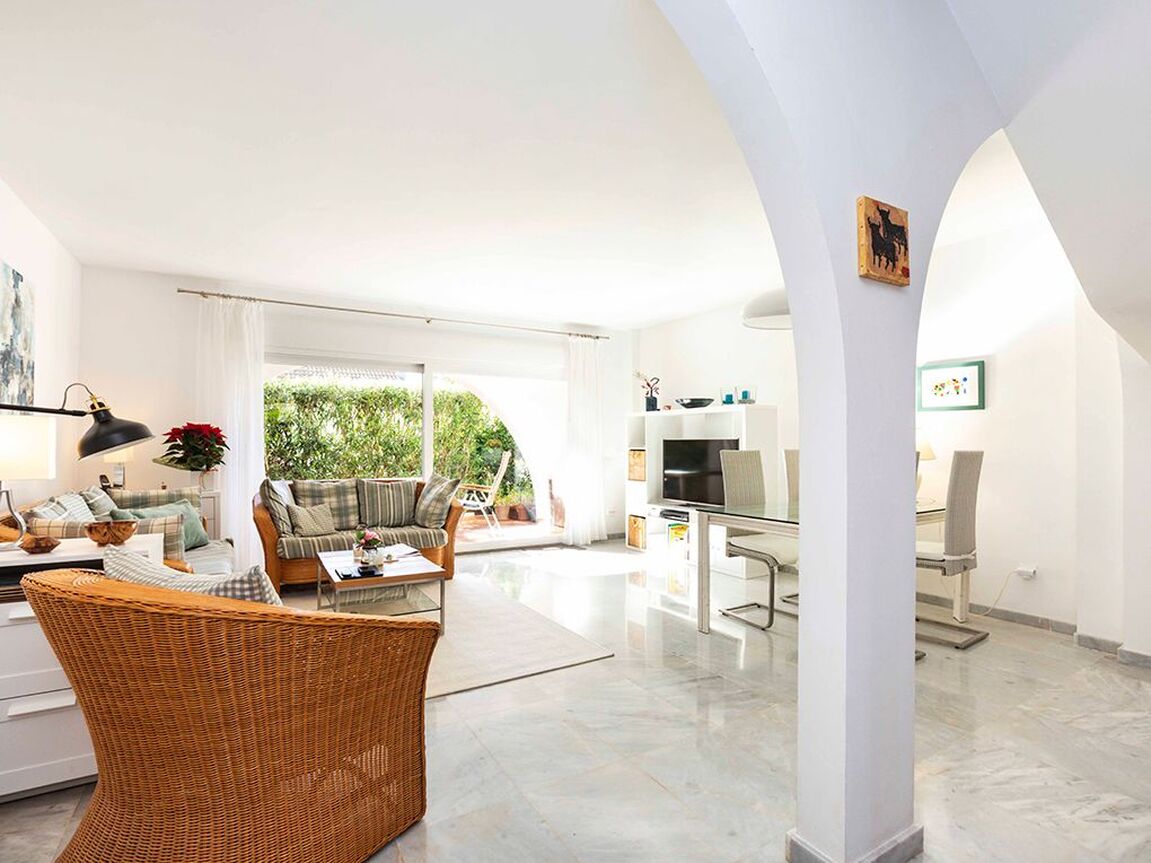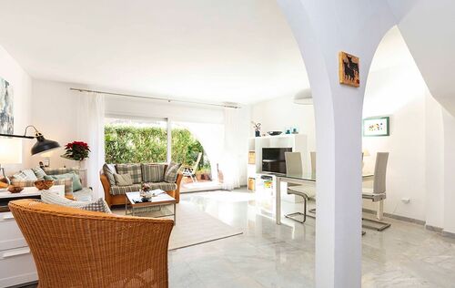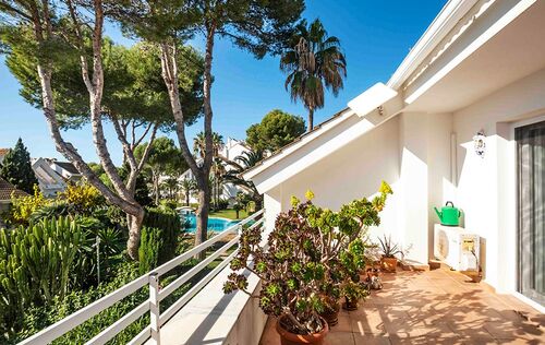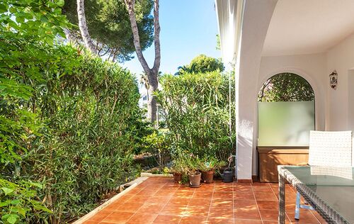 Located in the most sought-after area of Nova Santa Ponsa, this exceptional semi-detached house enjoys a front-line sea position within a prestigious and impeccably maintained gated community. Surrounded by lush Mediterranean landscaping and overlooking the sparkling blue waters of the southwest coast of Mallorca, the property offers a rare combination of privacy, tranquility, and breathtaking sea views. With approximately 150m² of living space, the house impresses with a spacious living and dining area that opens directly onto a private garden - an ideal setting for relaxing, entertaining, or enjoying unforgettable evenings. The fully equipped kitchen is designed for both functionality and comfort. The residence features three generous bedrooms, complemented by three bathrooms, a dressing room, and ample storage space. Mediterranean architectural elements, elegant marble floors and double-glazed windows create a warm and timeless atmosphere. Modern comforts such as air conditioning and central heating ensure year-round living at the highest level. Residents benefit from access to beautiful communal pools set within palm-lined gardens, offering a true resort-style ambiance directly by the sea. One of the standout features is the exceptionally rare sea-front community, making this property a true jewel in Nova Santa Ponsa. The parking space in community garage provides ample space for vehicles, storage, or recreational equipment. Just minutes away, the renowned Port Adriano marina offers an exclusive lifestyle with fine dining restaurants, stylish bars, boutiques, and a wide range of water sports including sailing, diving, and paddle surfing. The nearby sandy beach further enhances the appeal of this outstanding location. This property represents a unique opportunity to acquire a Mediterranean home in one of Mallorca’s finest coastal settings.