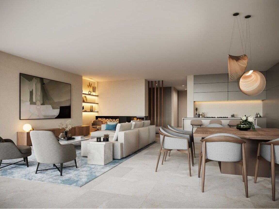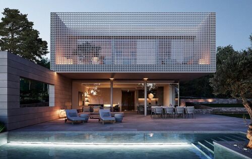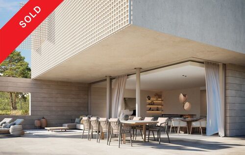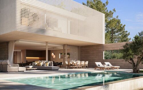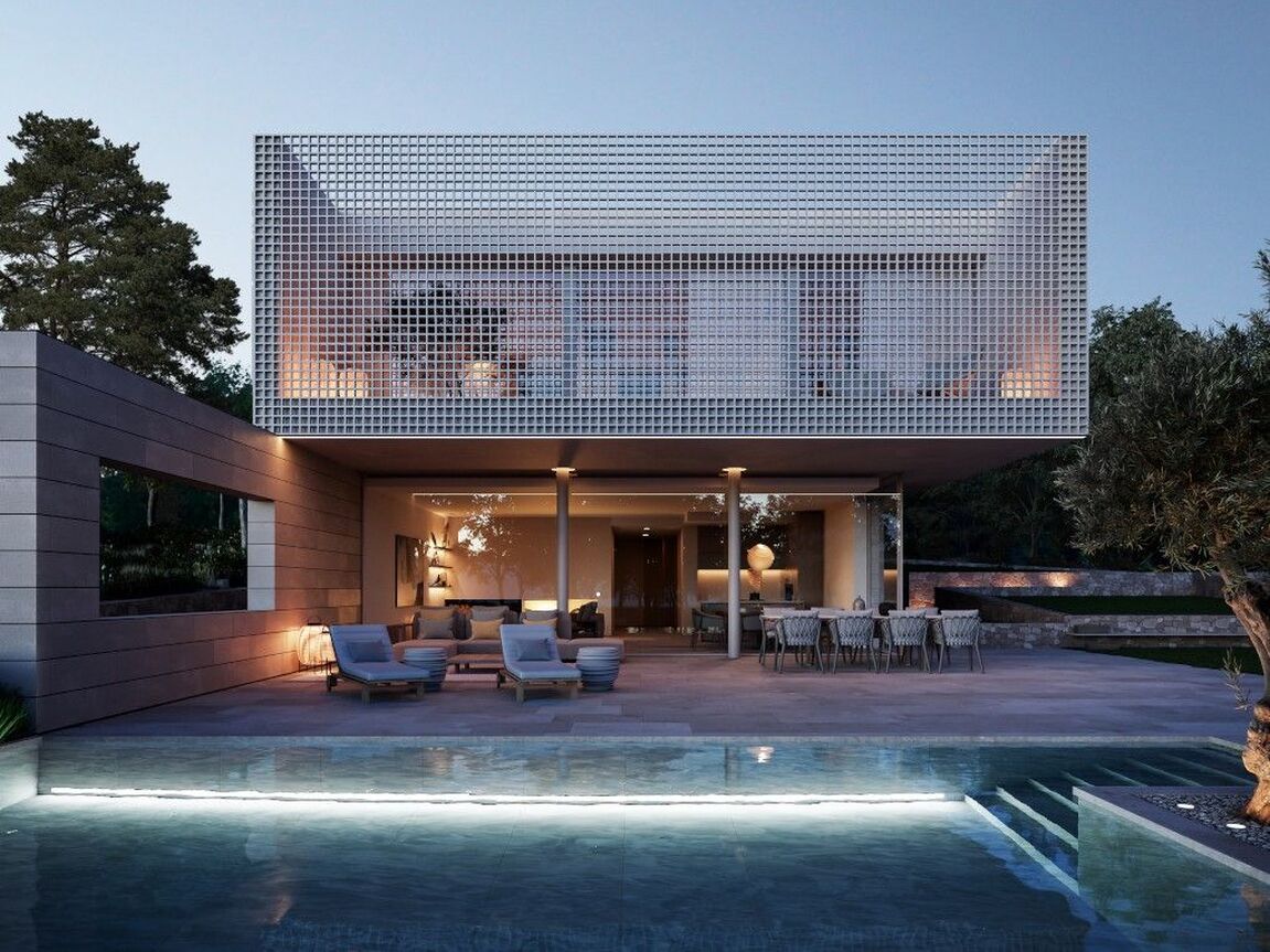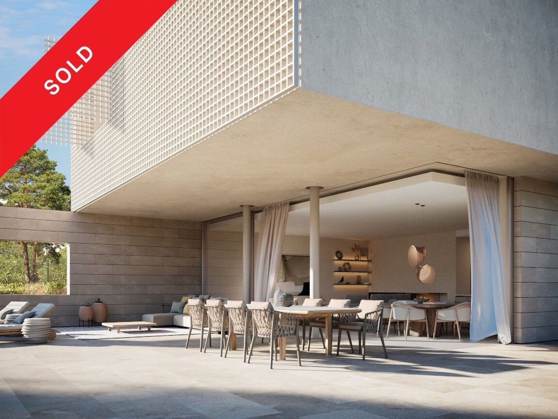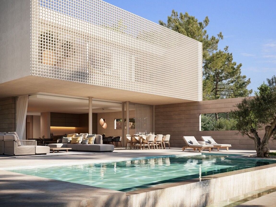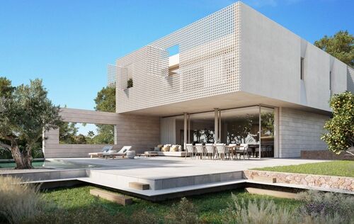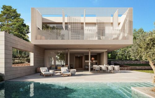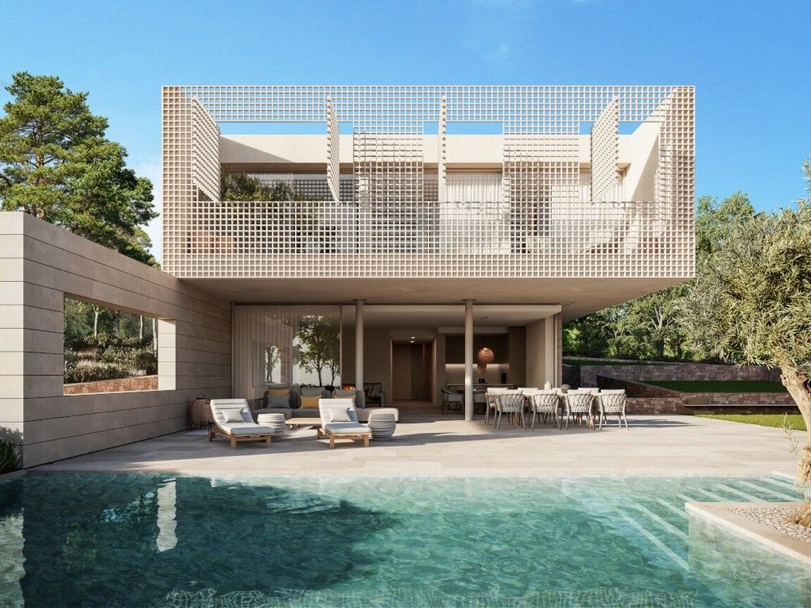 In the heart of Southwest Mallorca, surrounded by lush Mediterranean vegetation, the residential complex VERDEMAR with 11 detached villas with private Infinity Pools is being built directly by the sea. The location is quiet and central, only 15 minutes from Palma and 25 minutes from the airport. The bay of Cala Vinyes with fine sandy beach, turquoise blue water and a nice beach bar can be reached on foot in a few minutes. Everyday family life is also made easier by the proximity to international schools, sports and recreational facilities. Golf lovers have the Poniente Golf Club just a stone's throw away and other golf courses in the nearby area. The 11 villas share certain design elements and are particularly characterized by architecture with clean lines and a modern interpretation of the traditional laticcework, as well as the fusion of indoor and outdoor spaces. Enjoy the intimacy and tranquility that the villas offer you. During the planning process, special care was taken to ensure that the orientation of the buildings offers maximum privacy. Nevertheless, a sense of community is created by the path that connects all the houses and the private green area. Special attention was also paid to the use of local, sustainable materials. In addition, the metal lattice that surrounds the 3 front bedrooms upstairs is not only an impressive visual feature, but also allows air to circulate freely while filtering direct sunlight, keeping the homes cool. At the same time, it allows you to transform your bedrooms and terrace into a secluded oasis of tranquility. All bedrooms (3-4) are spacious and equipped with built-in wardrobes and ensuite bathrooms. The master bedroom offers an integrated, yet separable bathroom with huge spa shower. The centerpiece of the villas is the living and dining area with open kitchen with cooking island and floor-to-ceiling windows that open completely to the terrace and private garden with pool, creating a smooth transition from indoor to outdoor living. An additional spaciousness is created by the fact that a bright, large-format natural stone floor is laid throughout the house and on the terraces. A feel-good ambience is created by various elements made of wood and warm lighting. Other features include Gaggenau built-in appliances, Gessi faucets or similar, minimalist windows by Cortizo, Gira Smart Home, individually controlled air conditioning w/c and underfloor heating. Each house also has a garage or covered parking for several cars.