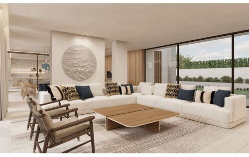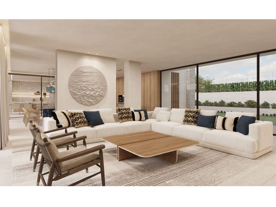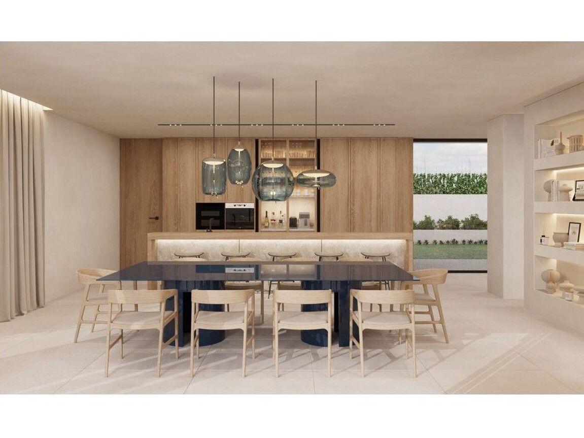 This extraordinary villa redefines contemporary luxury, seamlessly blending high-end finishes, avant-garde design, and breath-taking sea views in the exclusive enclave of Sol de Mallorca. Set on a 2,015 m² plot, this architectural masterpiece spans 1,096.91 m² on foundations made of robust concrete, sustainable building materials, and a focus on stability and sustainability, offering a harmonious fusion of indoor and outdoor living. The modern designed façade is a combination of natural stone, wood and SATE system for excellent thermal and acoustic insulation. Elegant expansive terraces with thermowood and HORUS BEIGE natural stone, and a 67.95 m² infinity saltwater pool create an idyllic retreat, surrounded by beautifully landscaped Mediterranean gardens as well as sophisticated outdoor lighting. Designed for ultimate comfort and elegance, the villa features five spacious bedrooms, including a lavish master suite with a spa-inspired bathroom, a private study, and multiple terraces that frame stunning panoramic views. Every detail has been carefully curated to provide an exceptional lifestyle, with a dedicated wellness area featuring a sauna and changing room, a state-of-the-art gym, and a private home cinema—a perfect balance of relaxation and entertainment. Smart home technology ensures effortless living, including a fully integrated KNX home automation system, energy-efficient heat pump, full air conditioning, sustainable rainwater management, aerothermal systems, underfloor heating, mechanical ventilation with heat recovery and energy-saving LED lighting. Scheduled for completion in June 2025, this exceptional residence presents a rare opportunity to own a true architectural masterpiece in one of Mallorca’s most prestigious locations. Further features: premium brands such as Miele and high-quality sanitary ceramics from GSI with wall-hung design and innovative Swirlflush flushing system, Dornbracht fittings, luxurious surfaces such as HORUS BEIGE natural stone and high-quality wood panelling and minimalist aluminium windows from CORTIZO.