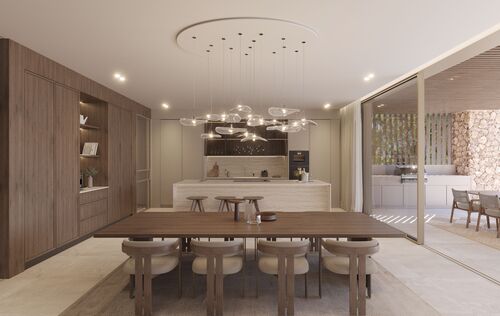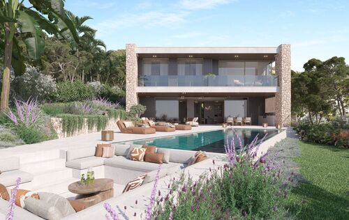 Gracefully located above the Mediterranean with sweeping sea views, this exceptional villa masterfully blends modern elegance, natural light and sustainable design. With 589 m² of living space on a 970 m² plot, it offers a serene and luxurious lifestyle in one of the most desirable coastal locations. From the moment you enter the ground floor, you are welcomed into a bright, open-plan living and dining area that flows effortlessly to a spacious terrace, chill-out lounge, and saltwater swimming pool, all oriented toward the sea. The seamless indoor outdoor layout invites relaxation and entertaining, framed by panoramic views and Mediterranean light. The first floor is dedicated to rest and privacy, featuring a grand master suite with walk-in closet and en-suite bathroom, along with three additional bedroom suites, all crafted for comfort and style. The basement level completes the home with a private gym, wine bodega, cinema room and a two-car garage. Every detail is thoughtfully designed, including a beautifully landscaped garden. High-quality finishes define the interior, including Gris Zarzi flooring and bespoke kitchen appliances. The villa features a KNX-controlled climate system with underfloor heating and comfort cooling for year-round comfort. Sustainability is at the heart of this home, with solar thermal panels for hot water and photovoltaic panels for energy efficiency, delivering high-end living with minimal environmental impact. Scheduled for completion in January 2026, this villa is a refined statement of architecture, innovations and Mediterranean beauty.